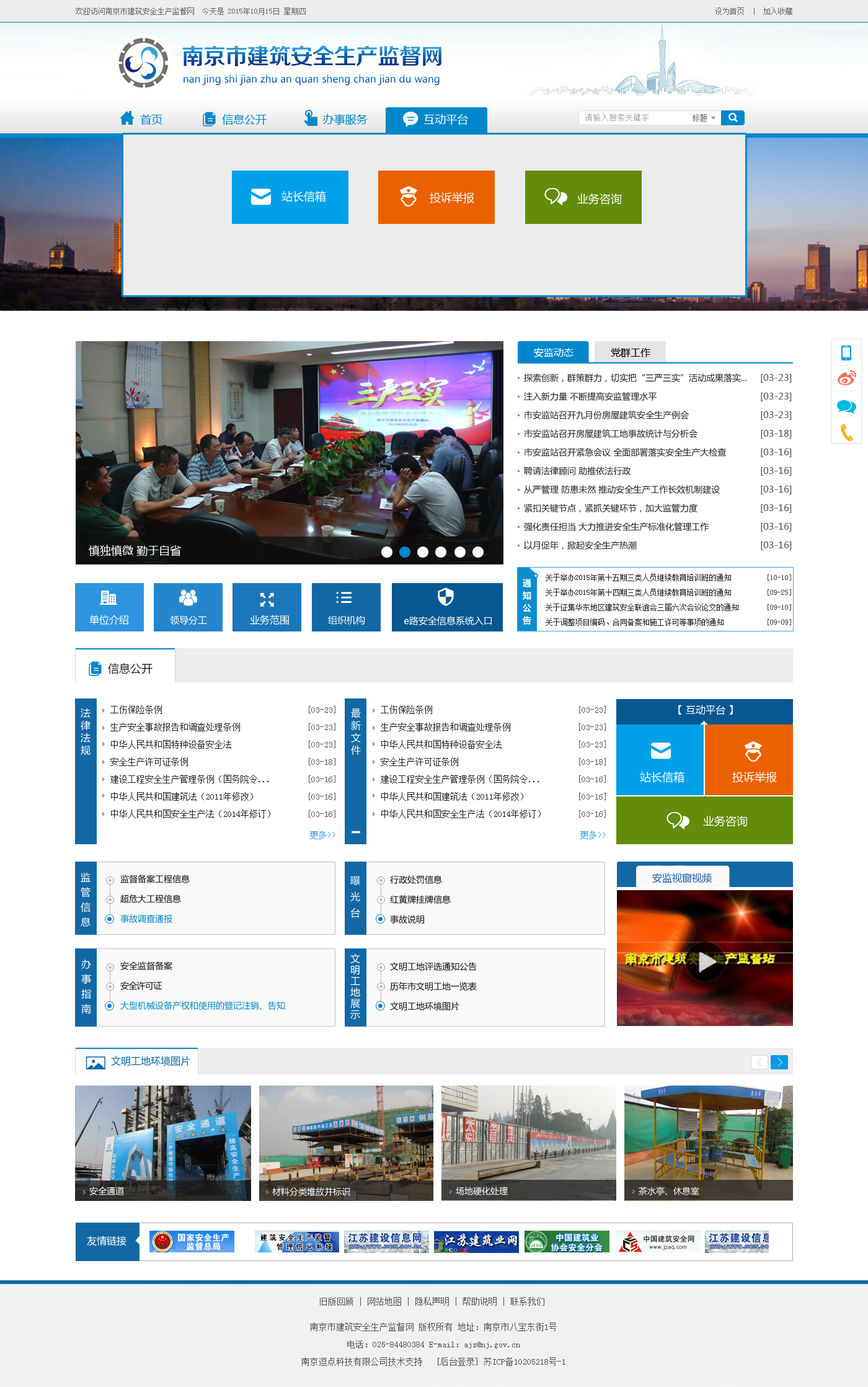 南京市建筑安全生產(chǎn)監(jiān)督站于1992年9月成立,是承擔(dān)全市建筑安全生產(chǎn)監(jiān)督與管理的事業(yè)單位。隸屬于南京市住房和城鄉(xiāng)建設(shè)委員會(huì)。負(fù)責(zé)主城區(qū)范圍內(nèi)市級(jí)(含)以上立項(xiàng)房屋建筑工程安全生產(chǎn)和文明施工的日常監(jiān)督管理。具體負(fù)責(zé)范圍內(nèi)施工現(xiàn)場(chǎng)監(jiān)督檢查、標(biāo)準(zhǔn)化工作管理推進(jìn)、市級(jí)文明工地評(píng)比和省級(jí)(含)以上文明工地推薦,辦理安全監(jiān)督備案、安全生產(chǎn)許可證初審、起重機(jī)械設(shè)備登記備案等事項(xiàng),參與生產(chǎn)安全事故調(diào)查,對(duì)各區(qū)監(jiān)督機(jī)構(gòu)進(jìn)行業(yè)務(wù)指導(dǎo)。